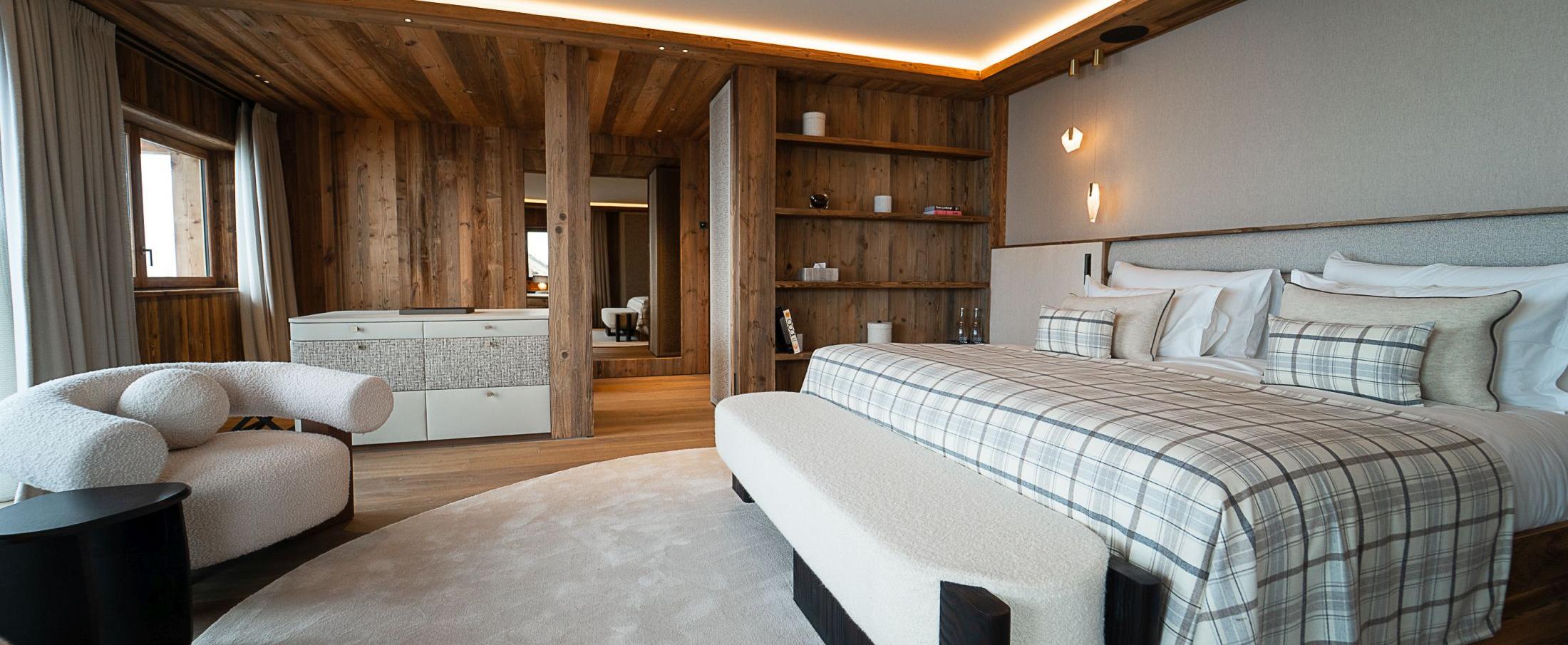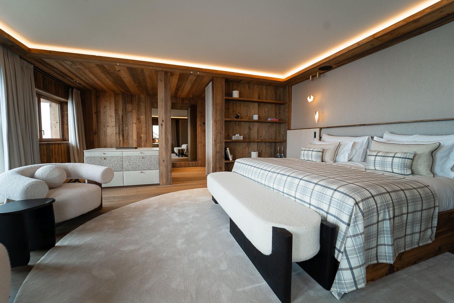 Chalet Moon 1850 can accommodate groups of up to 12 adults and 2 children, spread between seven bedrooms. The bedrooms have a graceful style, with plush soft furnishings and an elegant modern finish. There are two impressive master suites with an abundance of space, alongside four further double bedrooms, one of which can be set up as a twin. Lastly, a charming children's bunk room sleeping up to 4 guests takes care of any families with children. Naturally for a chalet of this calibre, all bedrooms are accompanied by a well-equipped en-suite, and all offer direct access to a balcony or terrace.